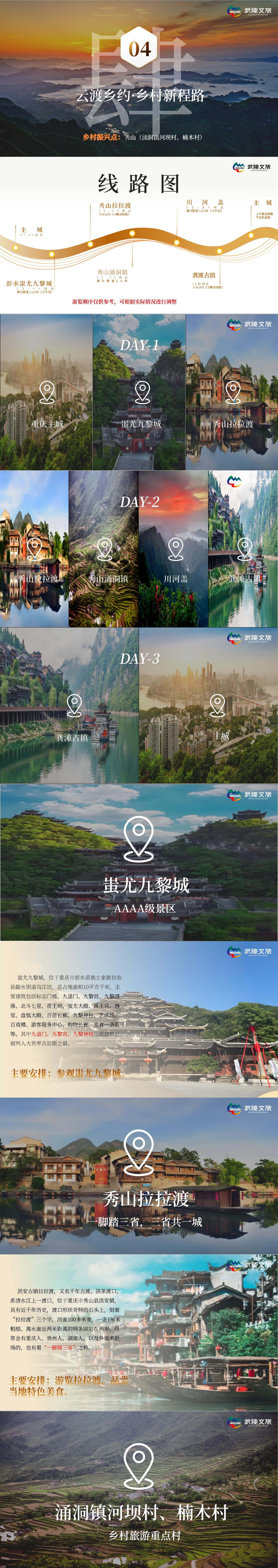 踏上《云渡鄉(xiāng)約·鄉(xiāng)村新程路》,開啟一場深藏于武陵山水間的詩意慢旅! 這不是一次簡單的觀光,而是一次與古老土地、淳樸鄉(xiāng)情和嶄新活力的深情約定。我們將循著時光的印記,探訪彭水蚩尤九黎城,感受苗族先祖的雄渾氣魄與璀璨文化;在秀山拉拉渡的悠悠槳聲中,回味古渡口的歲月靜好;深入涌洞鎮(zhèn),觸摸鄉(xiāng)村振興脈搏下的鮮活日常;登臨川河蓋,于壯闊云海草場之上,盡覽天地大美。最后,乘一葉輕舟,漫游于龔灘古鎮(zhèn)的碧波畫廊,讓千年吊腳樓的倒影與烏江的清風,滌蕩心靈。這條精心編織的“新程路”,邀您暫別喧囂,在山水田園的畫卷里,找回生活的本真,共同見證美麗鄉(xiāng)村的蓬勃新姿。